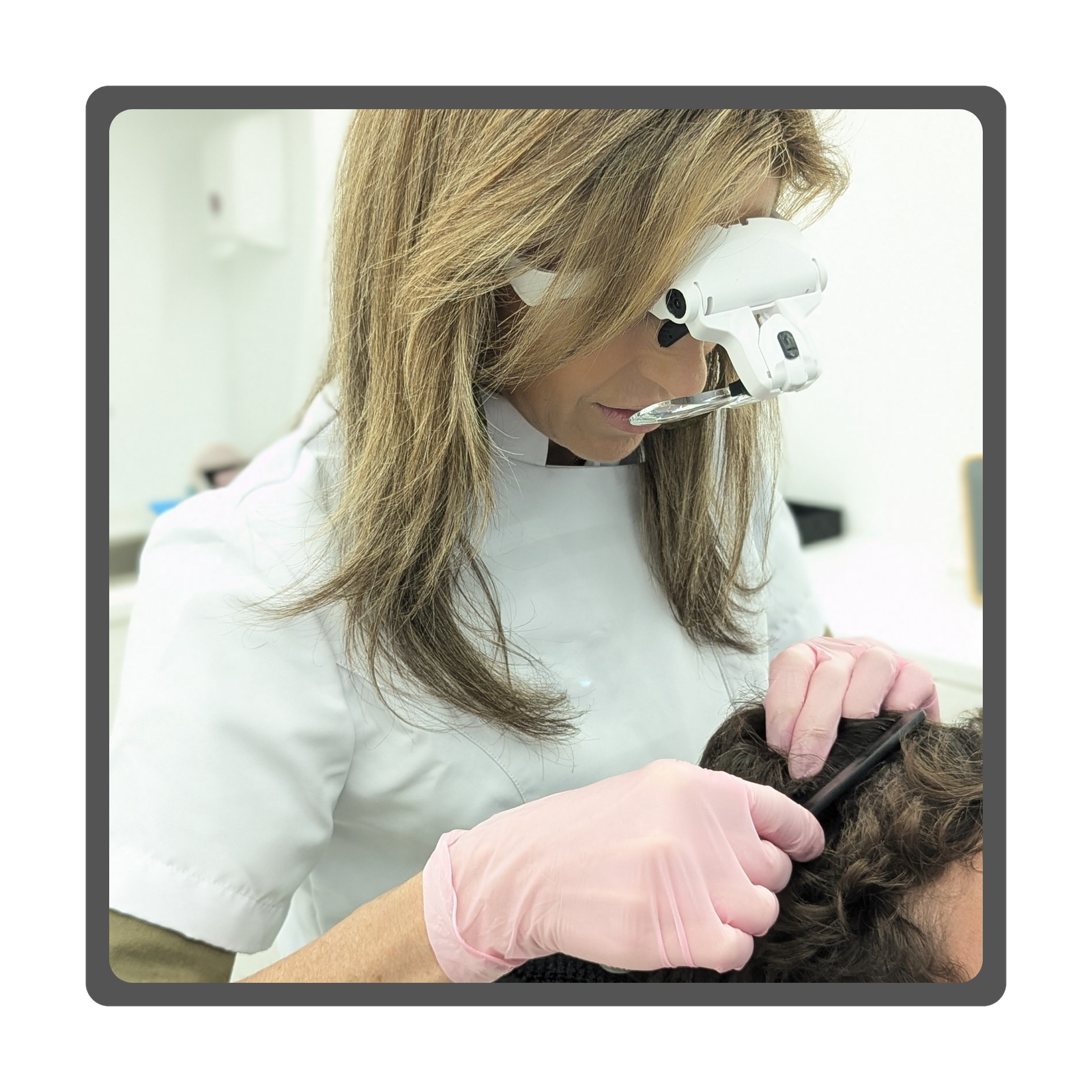 Fotografía de parte superior de Marga Onandía, con bata con el logo de Marga Onandía
